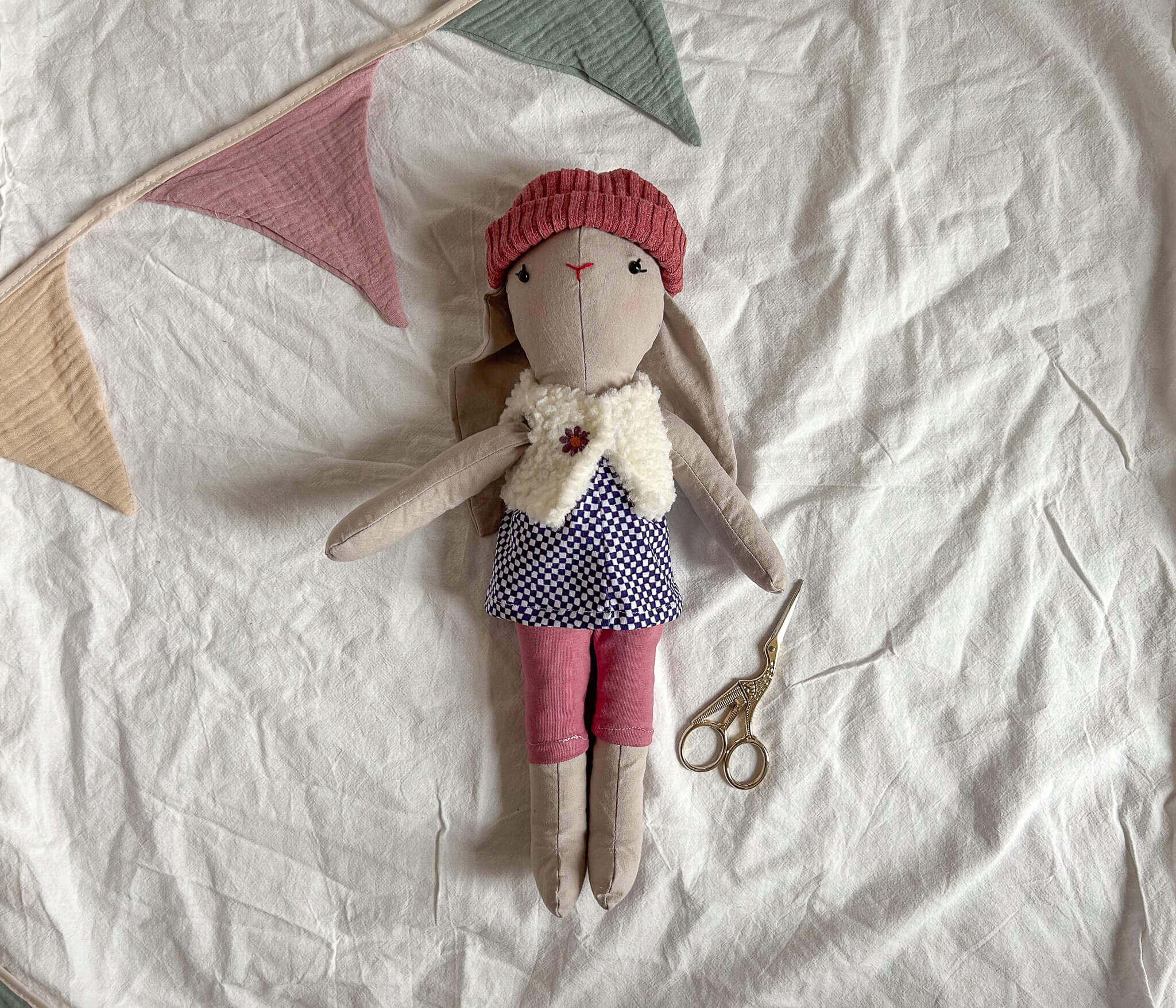 Mit dem Schnittmuster Hase Lira kannst du ein liebevolles Stofftier für Kinder ganz einfach selbst nähen. Der süße Hase wird aus Baumwolle oder Leinen gefertigt, seine Kleidung aus Jersey oder French Terry – so entsteht ein kuscheliger Begleiter, der zum Spielen, Kuscheln und Liebhaben einlädt.