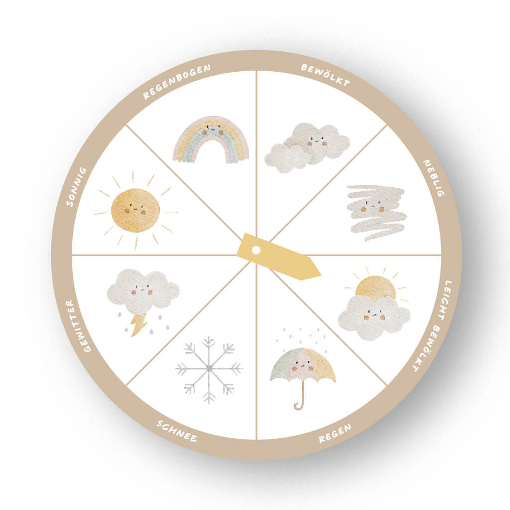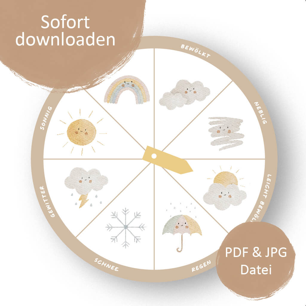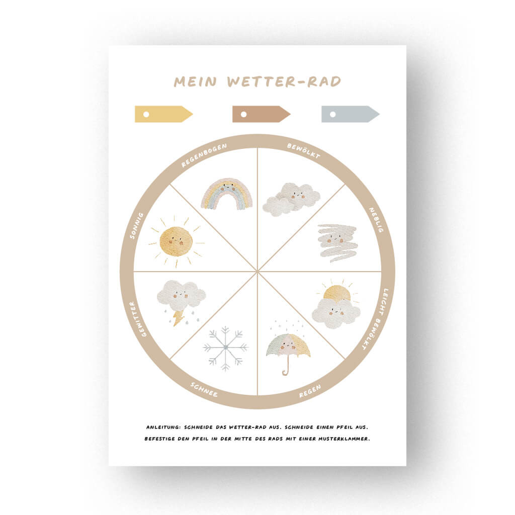 []">Das handillustriertes Wetter-Rad für Kinder zeigt acht verschiedene Wetterarten und ist so gestaltet, dass es leicht verständlich ist. Es bietet eine pädagogisch wertvolle Möglichkeit, das Wetter zu lernen und fördert die Selbstständigkeit der Kinder, indem sie aktiv mit den Wetterbedingungen interagieren können. Mit dieser Lernvorlage wird das Wetter zu einem spannenden Thema, das die Neugier der Kleinen weckt und ihr Wissen erweitert.